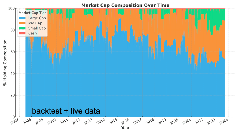 Large and Mid-Cap Concentration of Profitable Companies: Primarily holds large and mid-cap stocks with selective allocation to small-caps offering a stable foundation. In backtests over 15 years and live performance, show the portfolio holds high-quality companies with steady earnings and profitability.